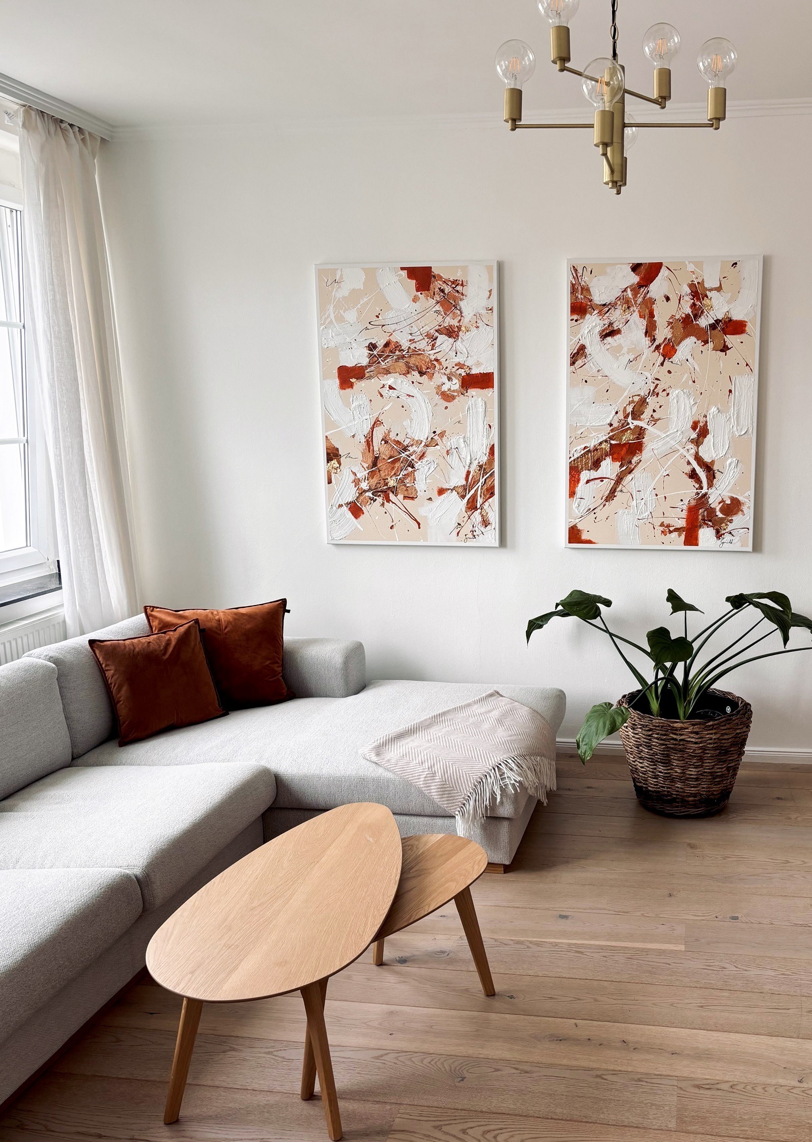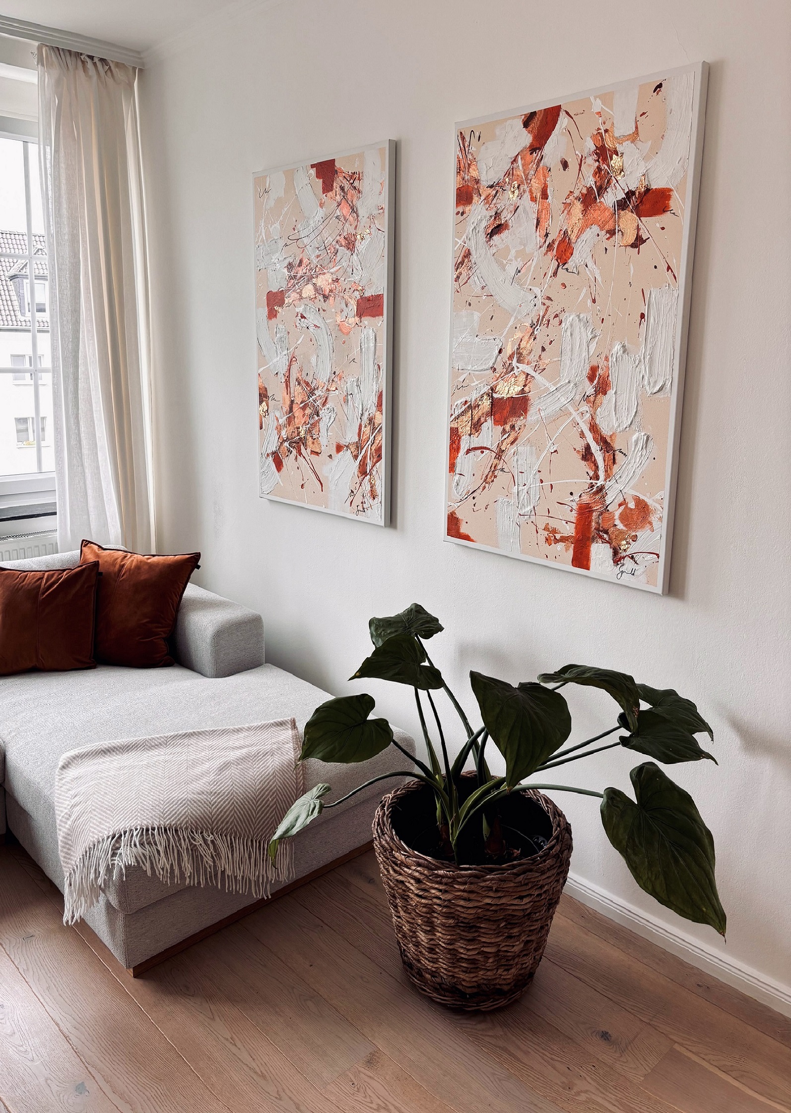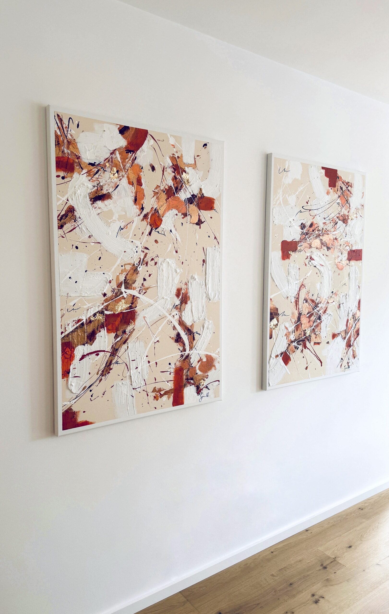 Inspired by the elegance of copper and gold, this series features white structural elements, a range of red and orange tones and shimmering copper, all highlighted by touches of gold leaf, set against a soft beige background