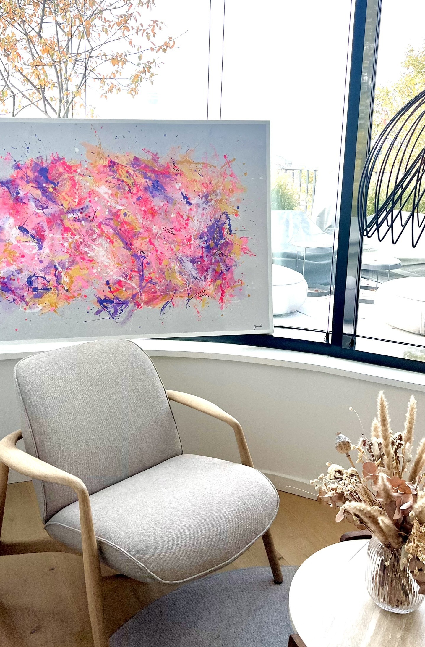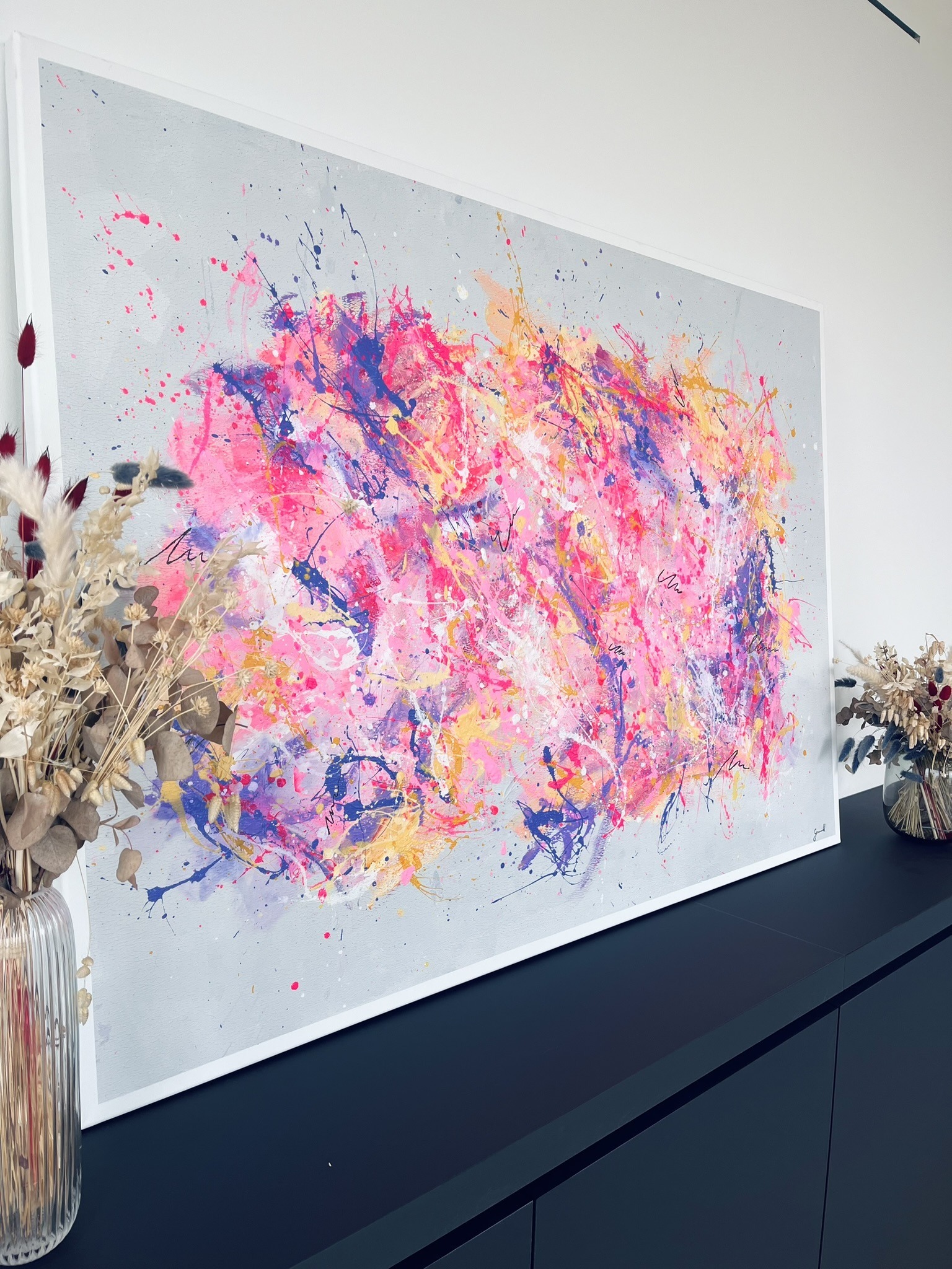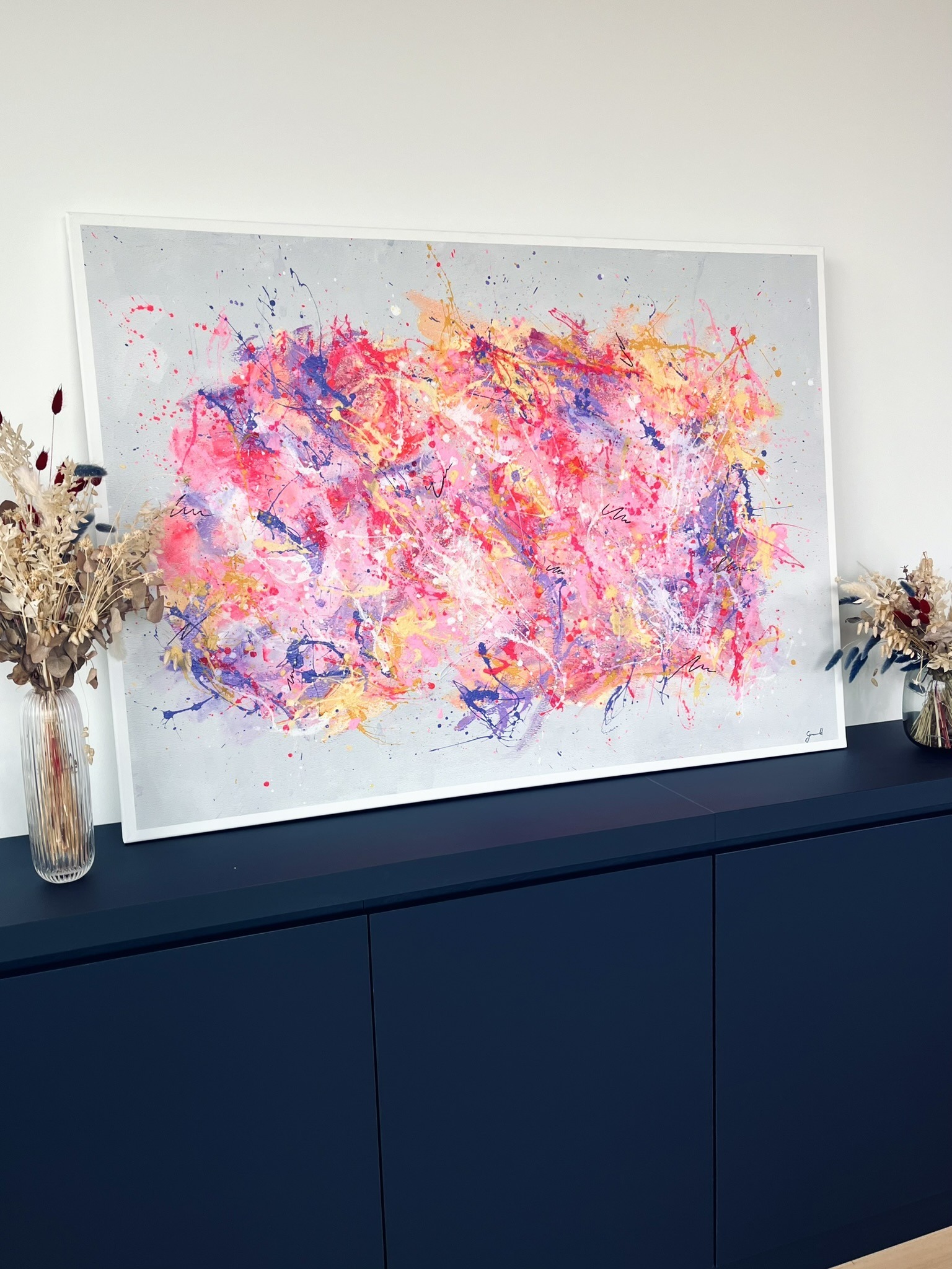 Inspired by the soft, airy texture of cotton candy, this piece swirls with gentle pink, purple, white, and yellow tones on a gray canvas, with the colors centered in the middle like a cloud, evoking a sense of sweetness and lightness