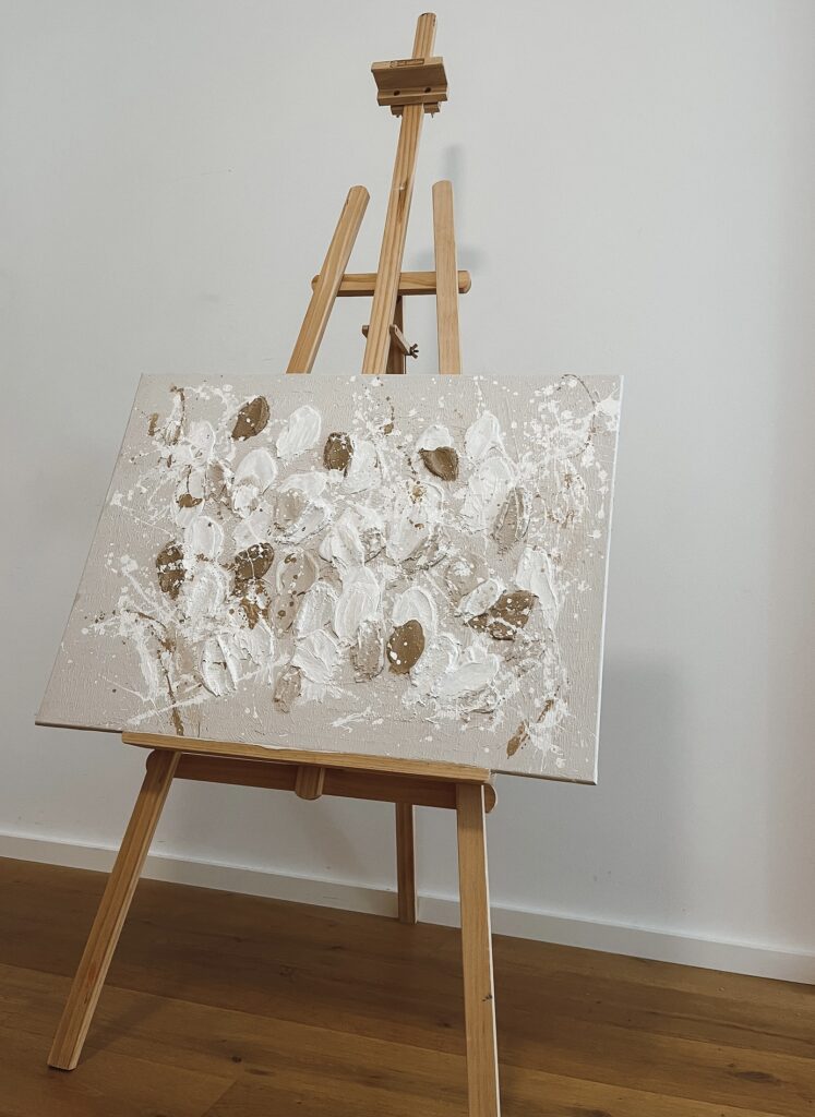 Inspired by the vastness and mystery of desert landscapes, this piece blends light beige textured tones with a modeled pattern of sand-colored elements. White accents and splatters evoke the soft dust and shifting sands, adding depth and movement to the composition