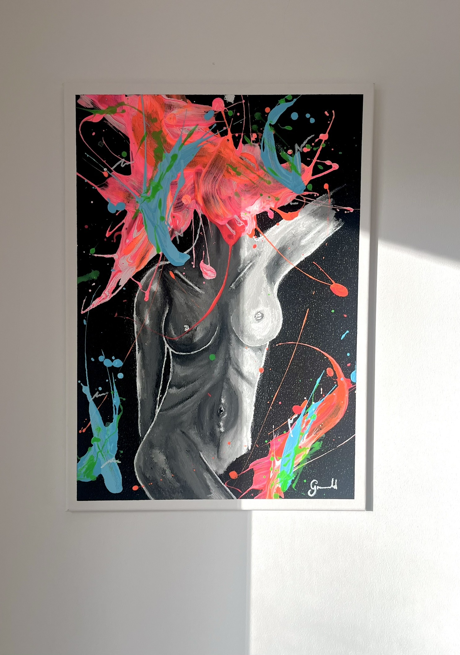 Inspired by the fluidity of the human form, this abstract piece features the silhouette of a nude woman, seen from the front, surrounded by vibrant splashes of pink, orange, blue, and green