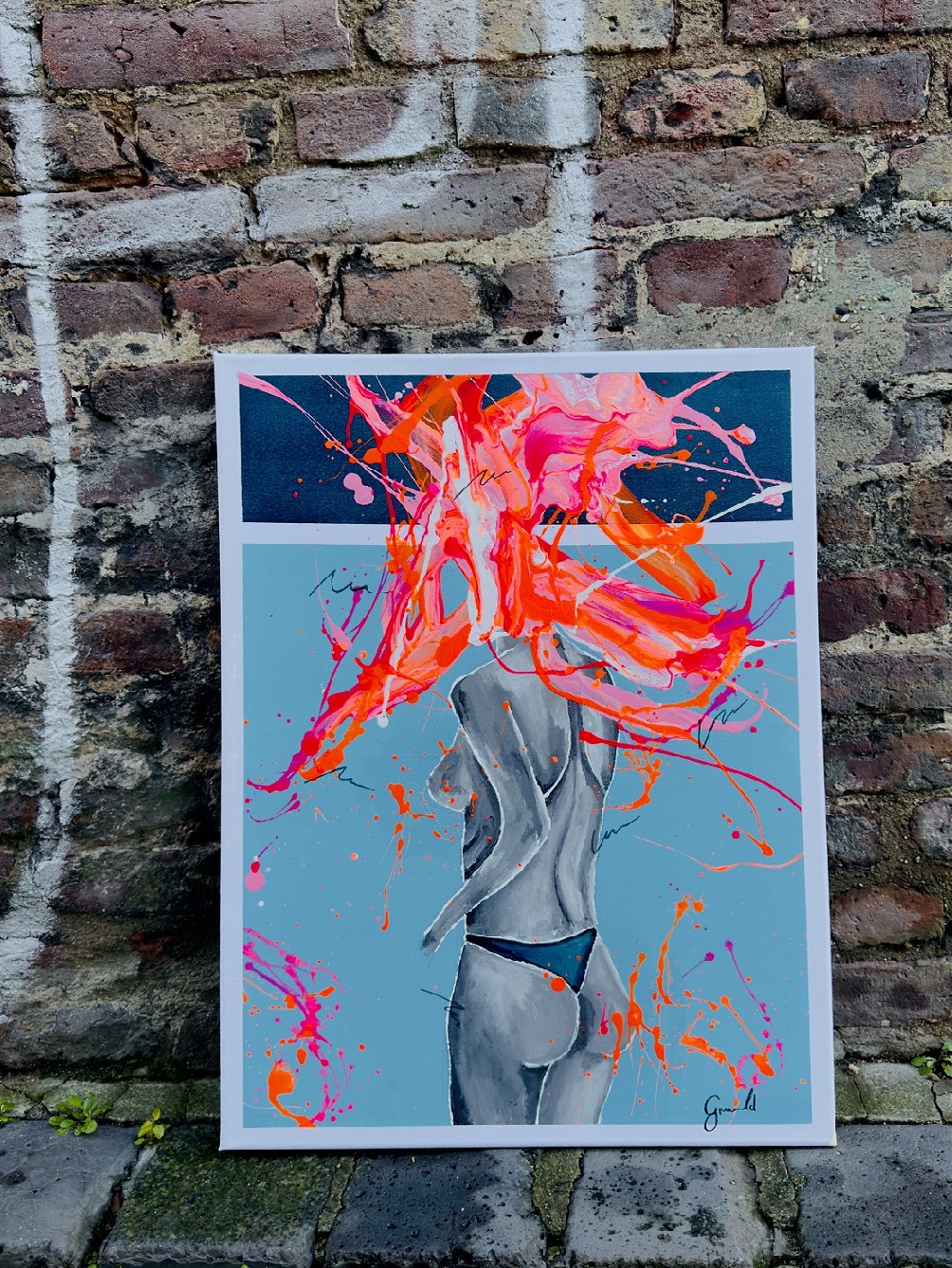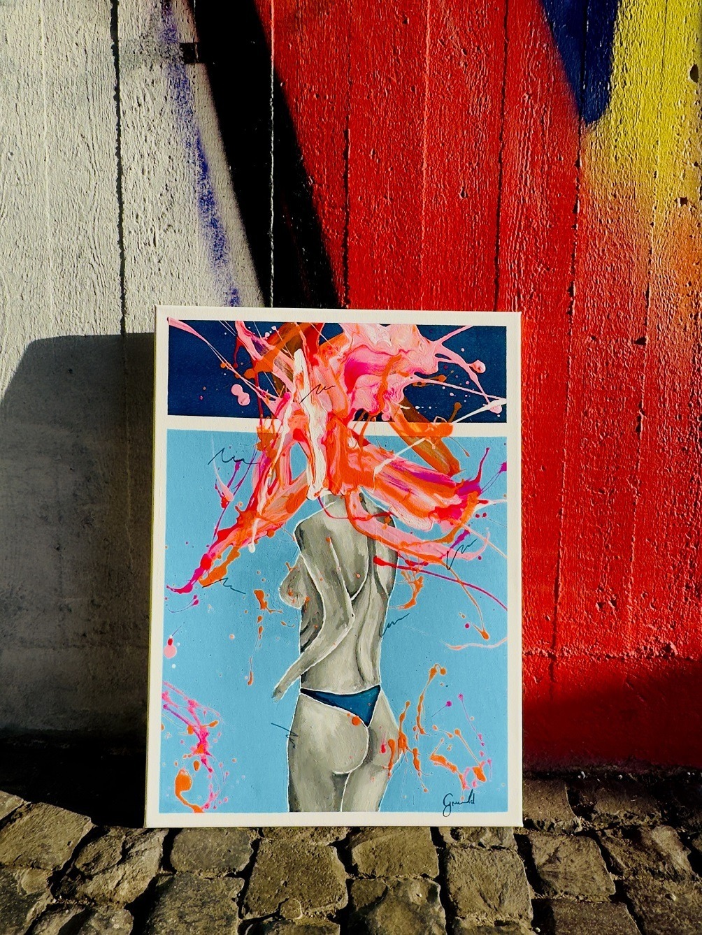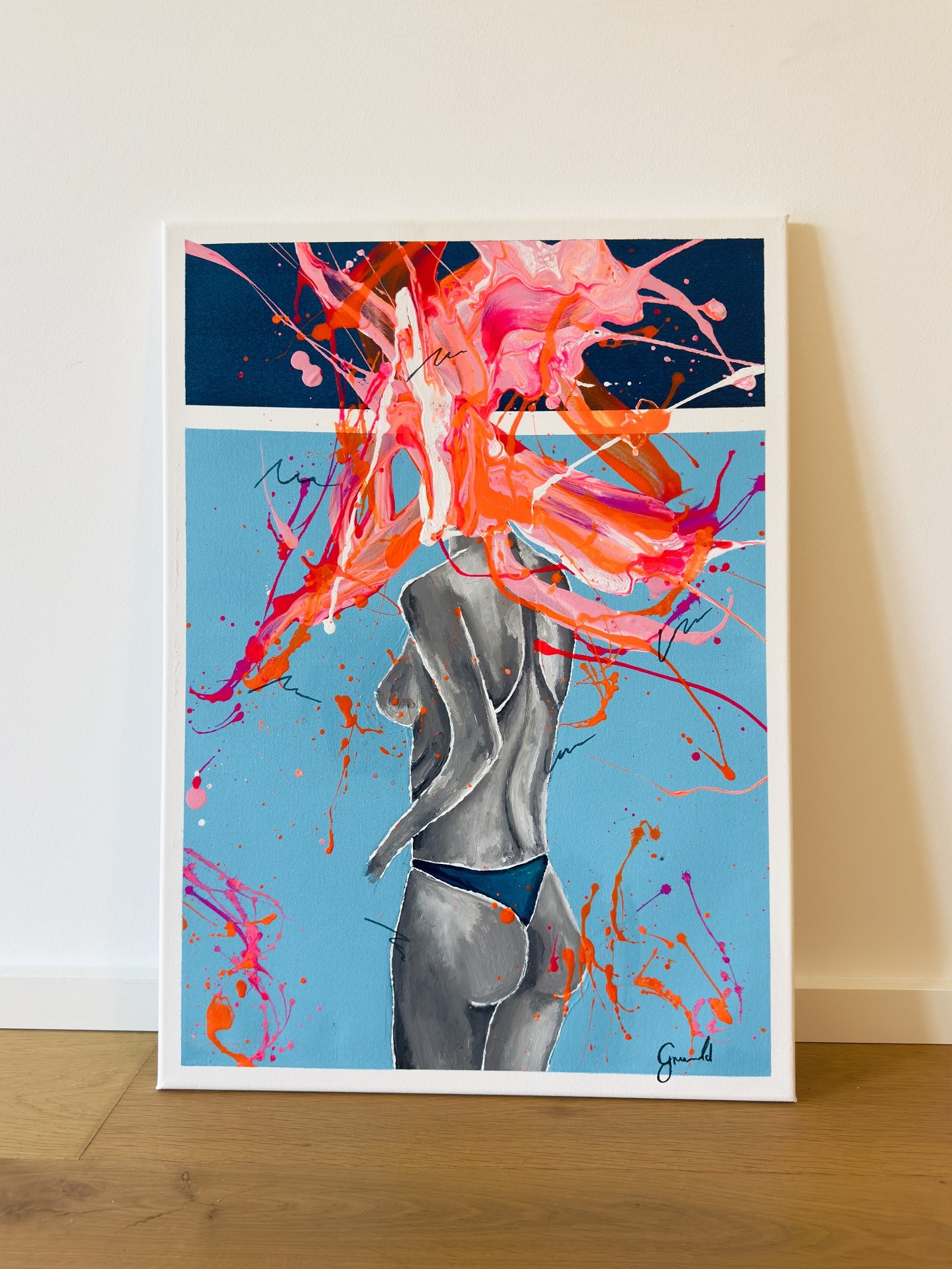 Inspired by the raw beauty of the human form, this piece depicts a nude woman from behind, her figure accentuated by vibrant splashes of orange and pink, set against a background of contrasting light and dark blue, creating a dynamic interplay of color and form