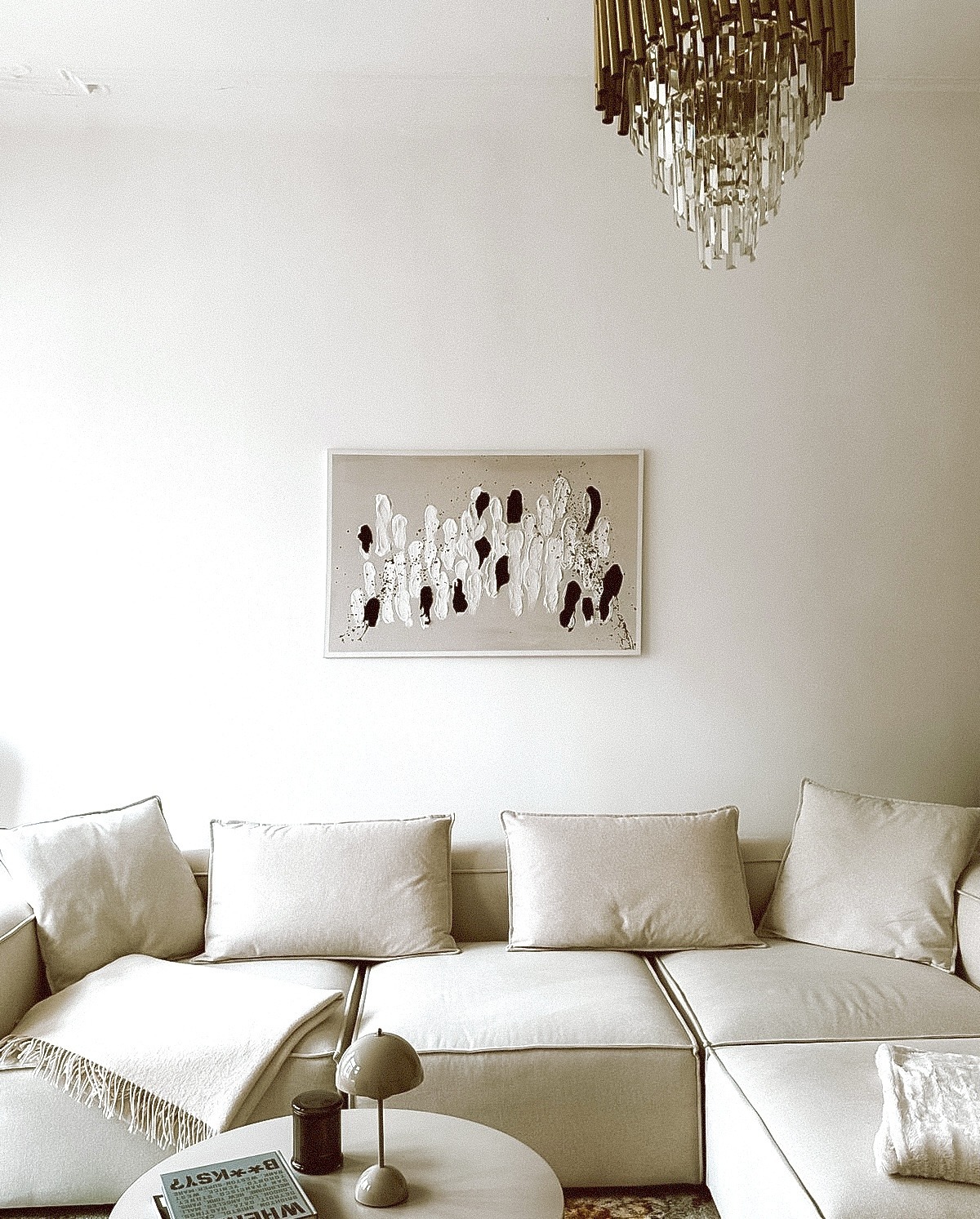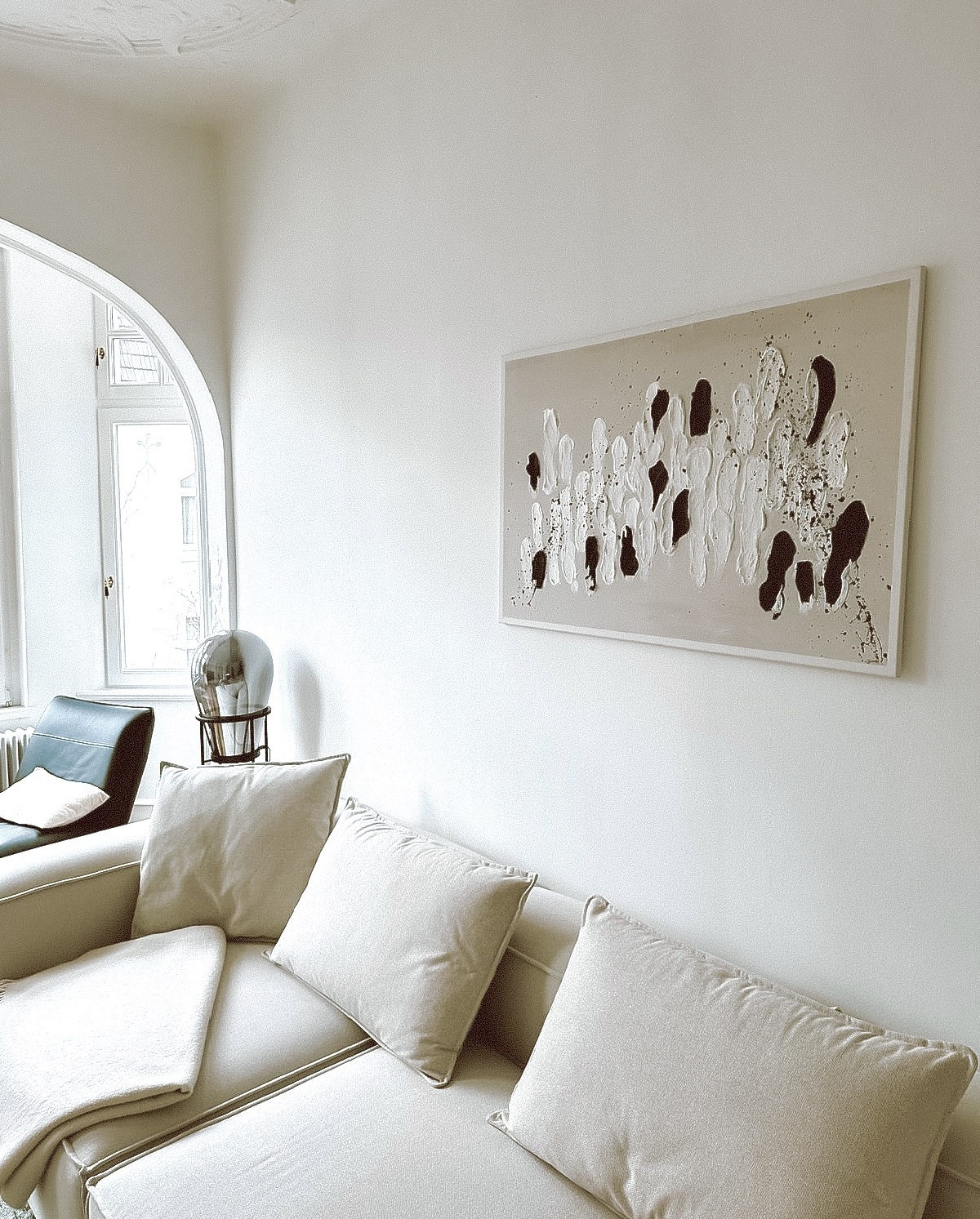 Inspired by the harmony of contrasts, combining white and black tones on a beige canvas, this piece uses textured paste to create a captivating interplay of light and shadow