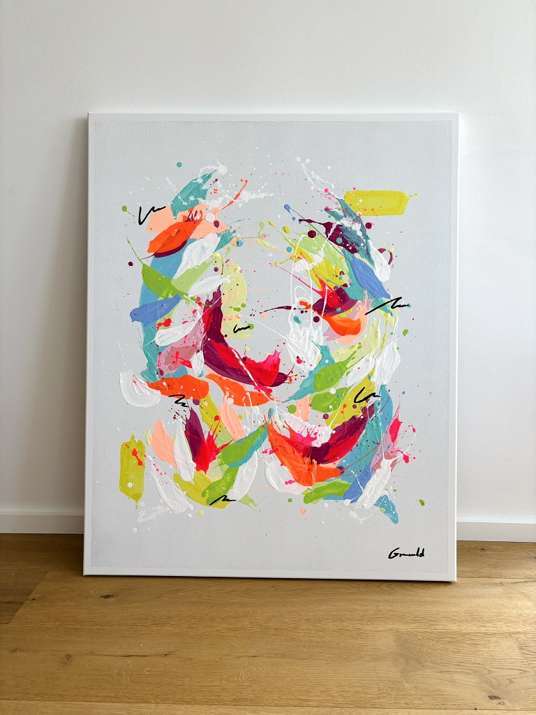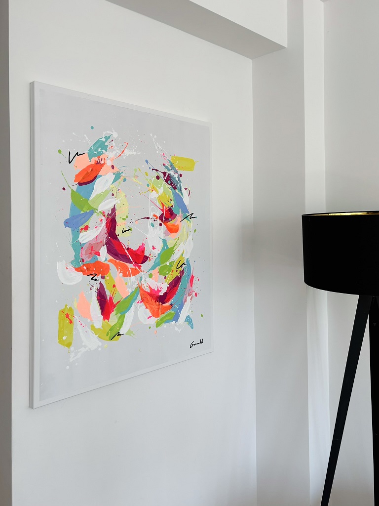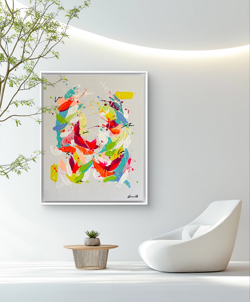 Inspired by the lively spirit of a butterfly in flight, Papillon blends vibrant reds, greens, and blues with dynamic white and neon accents to create a sense of joyful motion. Set against a light gray canvas, the colorful composition evokes the delicate symmetry and energy of fluttering wings in spring