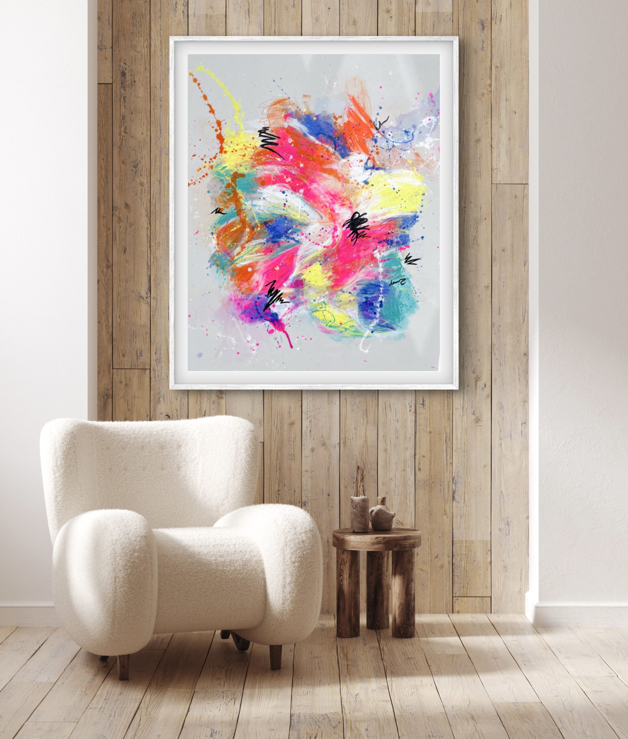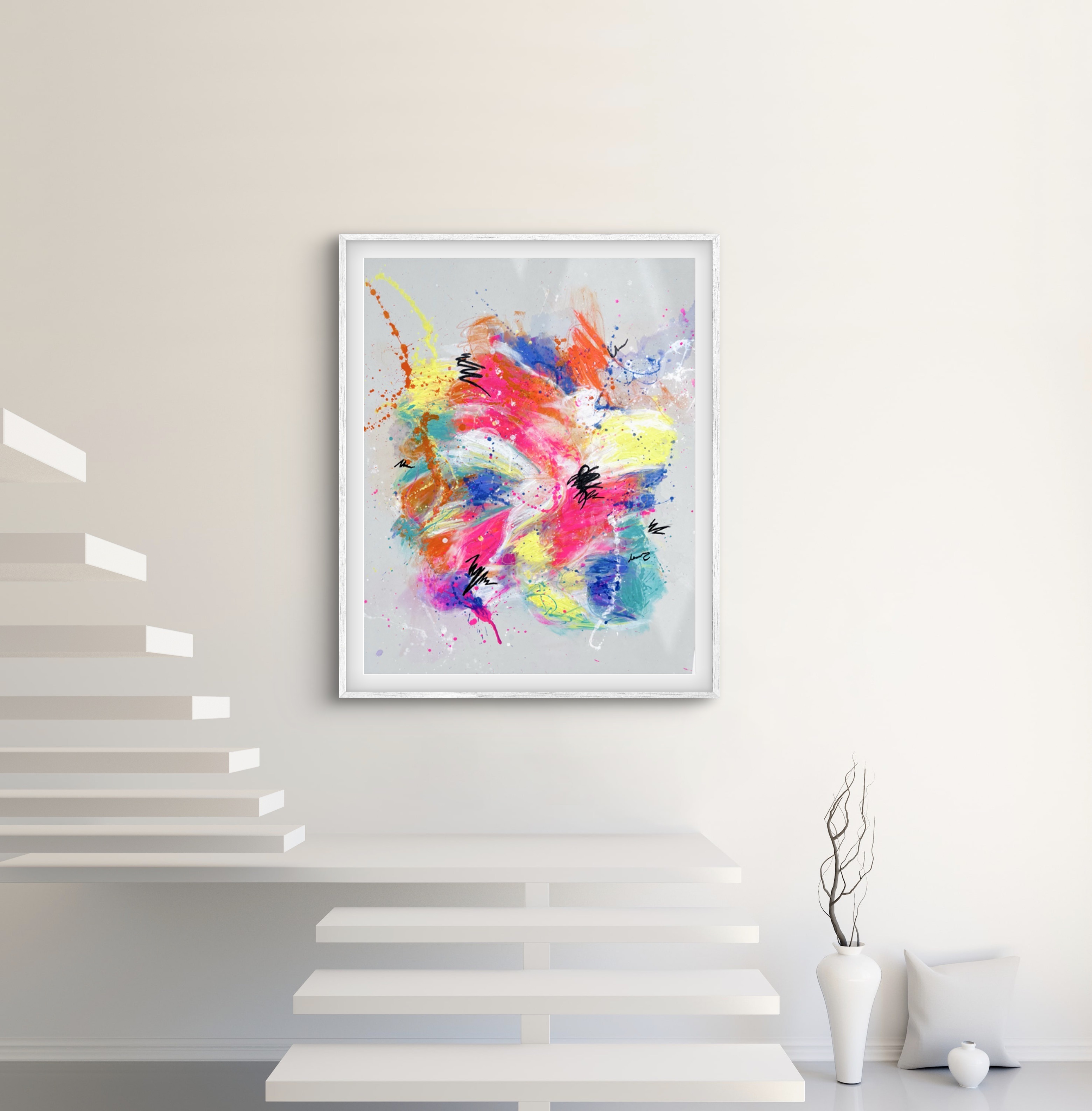 Inspired by the vibrant beauty of pastel hues, this piece blends soft pink, blue, and yellow tones with dynamic splashes of neon, creating an energetic and joyful expression on a light gray canvas