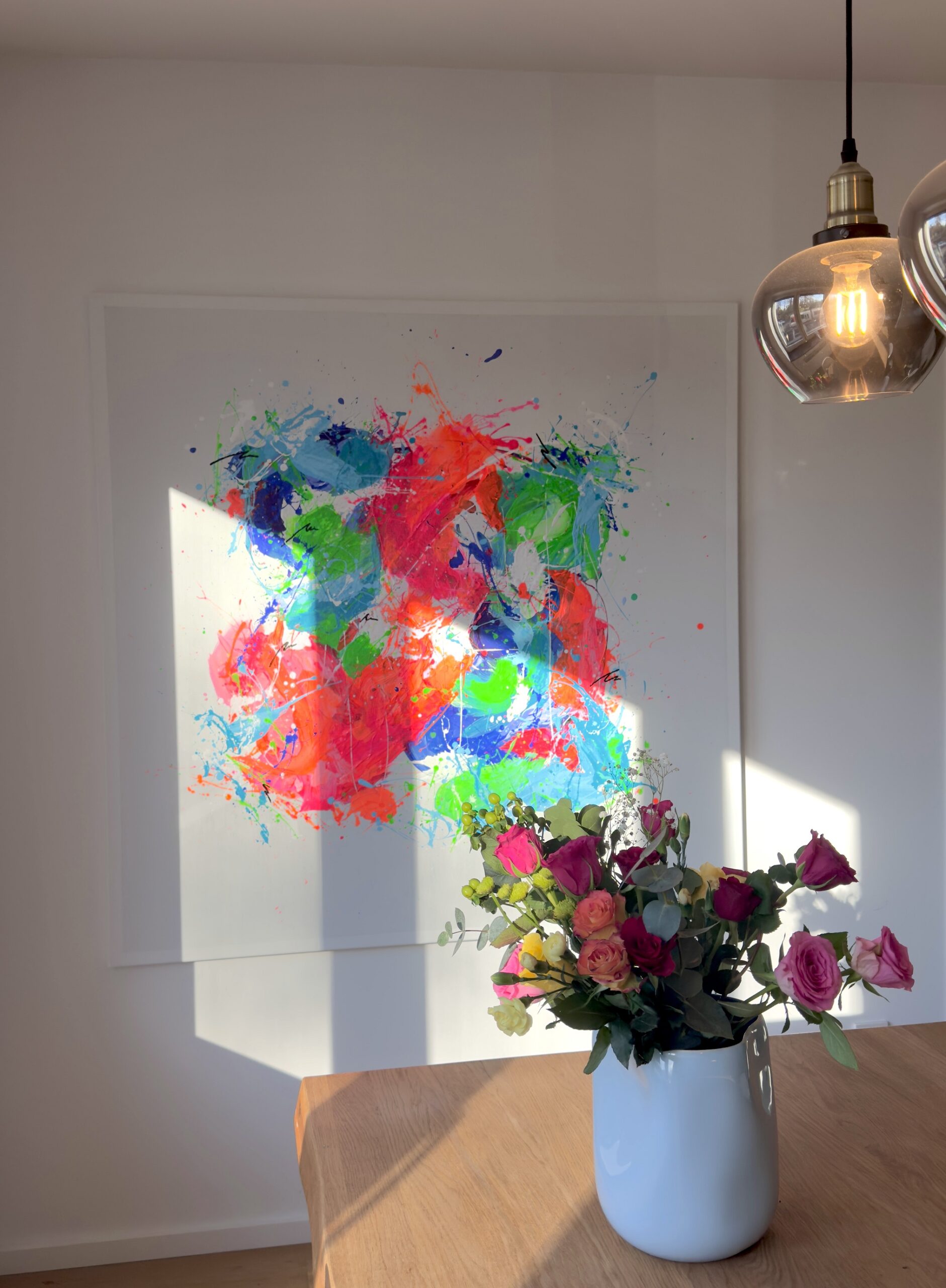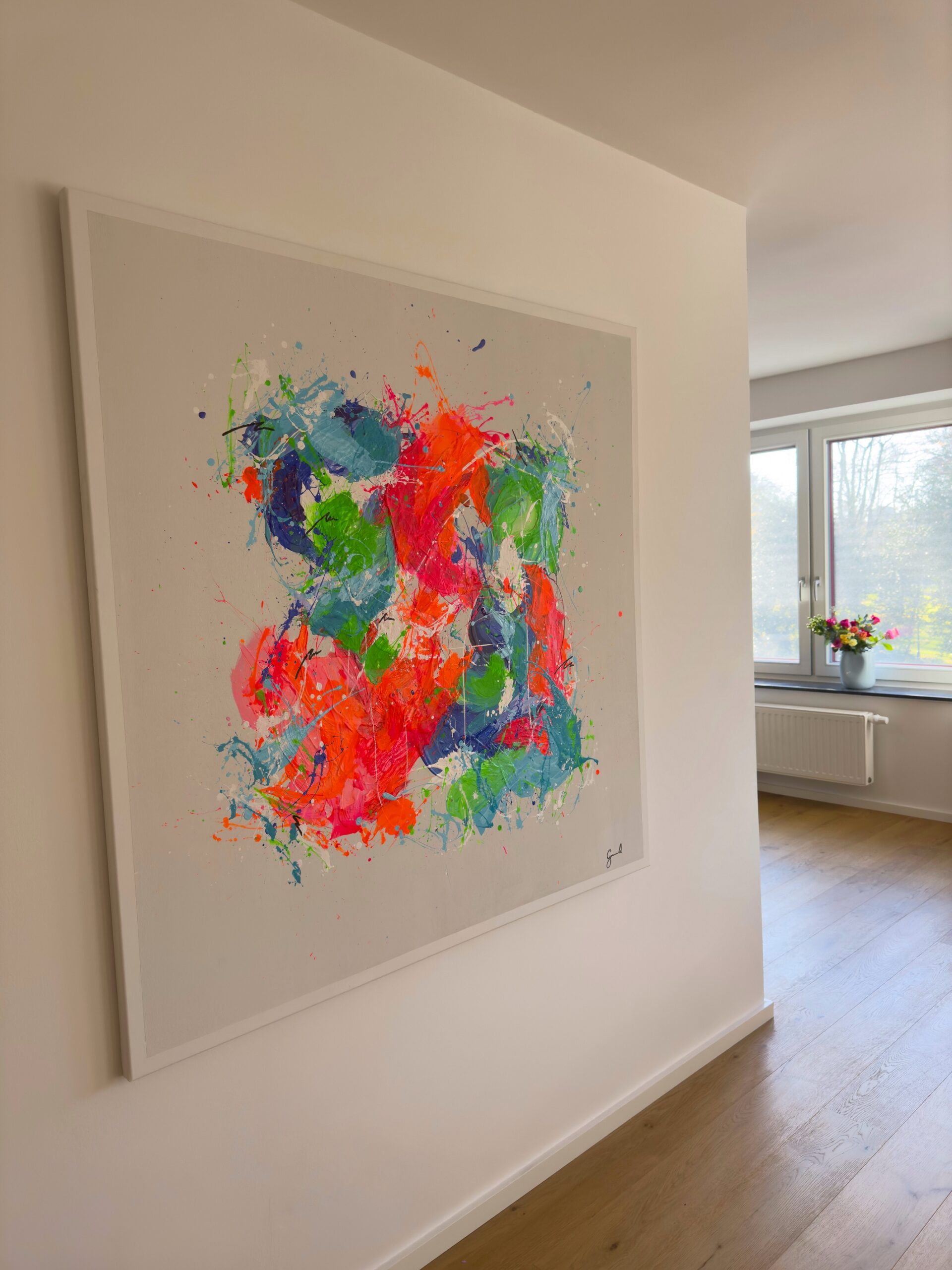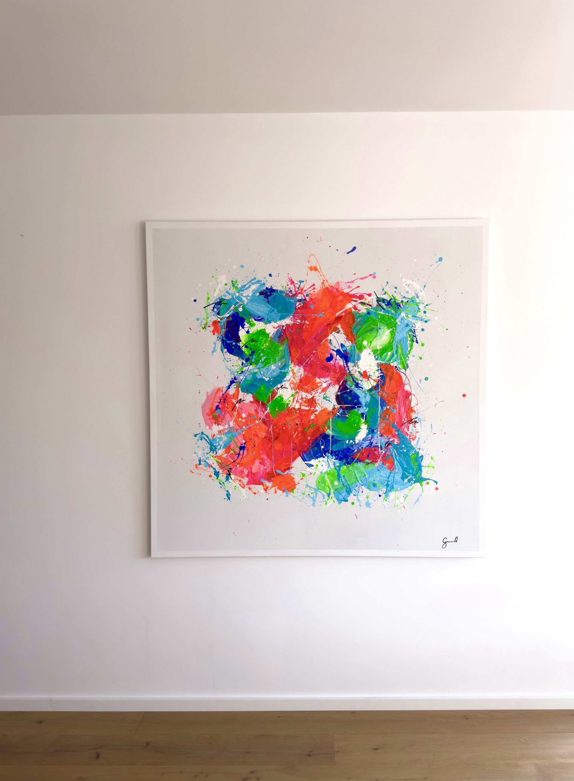 Inspired by the freshness of spring, this square piece bursts with vibrant colors on a light gray background, capturing the energy and renewal of the seasonย